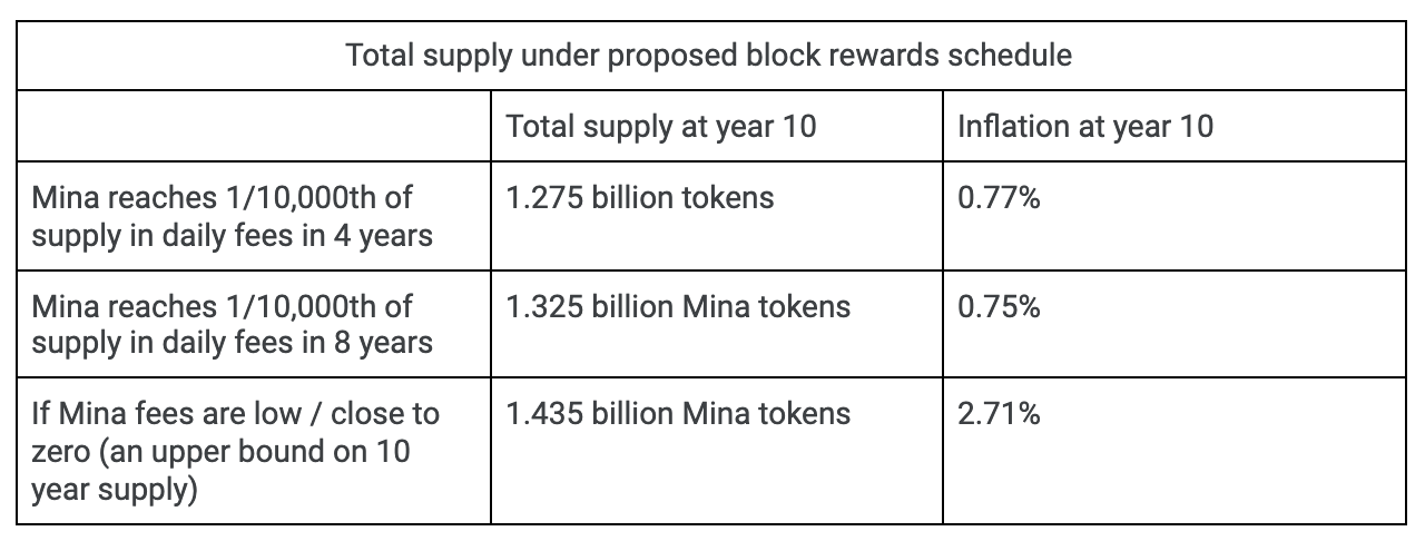 High level, the proposal is, we lower inflation inflation vs the original tokenomics, to ensure weโre not creating excess inflation on top of what is needed for a high staking percentage. Additionally, we use some mechanism to use fees to replace block rewards, so that once fees become larger, effective inflation drops to zero. Assuming Mina reaches wide use in 4 years (as measured by Ethereum today, assuming similar fees relative to total supply), this caps the total 10 year supply at 1.275 billion Mina.