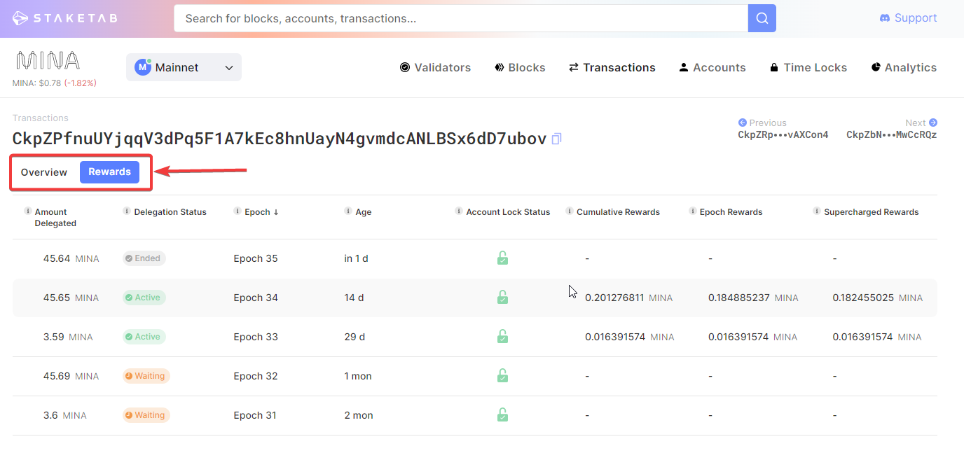 - The account was unlocked in the active delegation and rewards started to produce https://mina.staketab.com/mainnet/transaction/CkpYrz5jvymY9R3d4a23CMAT7LMUVE3tUqTxSY6nGk4MTZ5ysAxTK/txRewards?limit=50&orderBy=DESC&page=0&sortBy=epoch