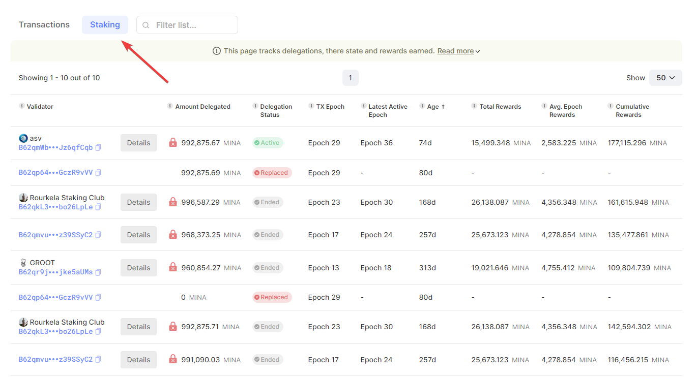 This page tracks delegations, their state and rewards earned during the delegation process.