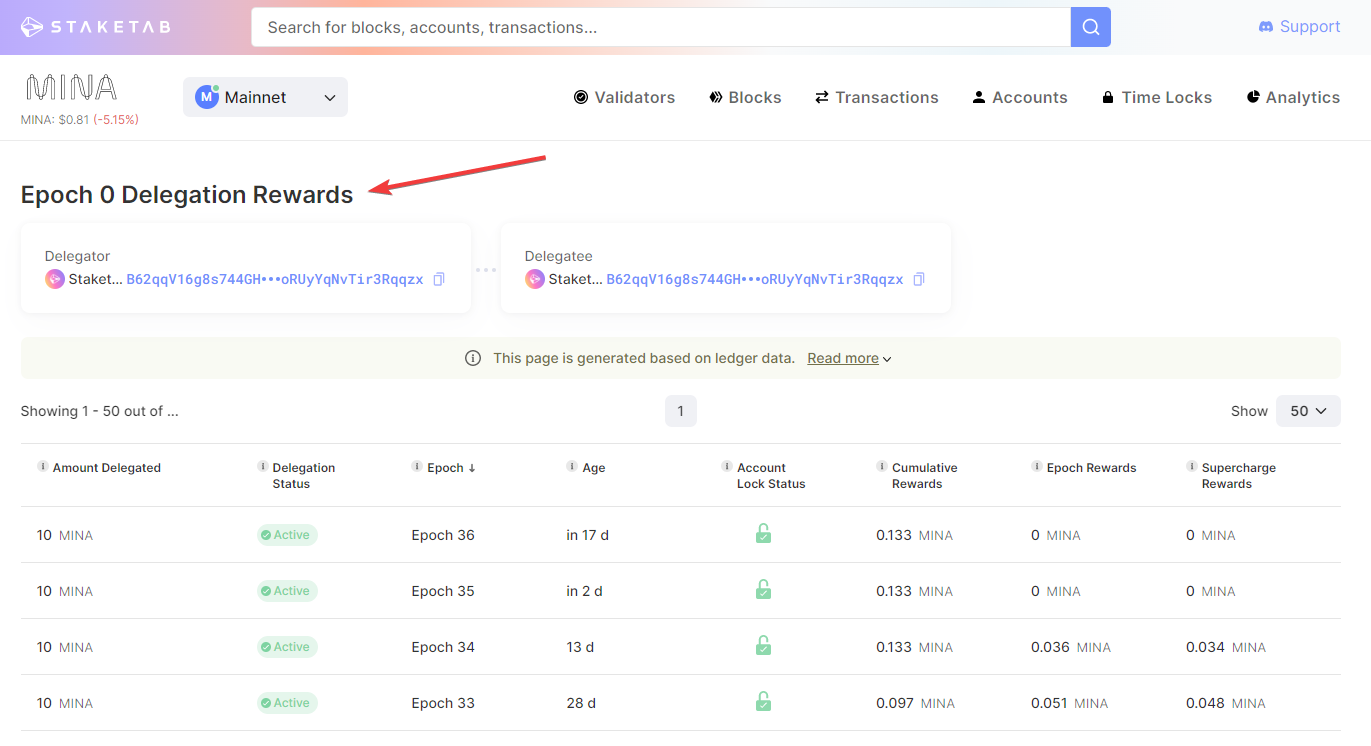 - Epoch 0 delegation https://mina.staketab.com/mainnet/ledger/delegation/B62qii9M7moTAxxcG26MfdCuhWajNiKFLf3t5cqvy6eWuEAX8HexWiD/0?limit=50&orderBy=DESC&page=0&sortBy=epoch